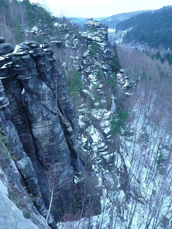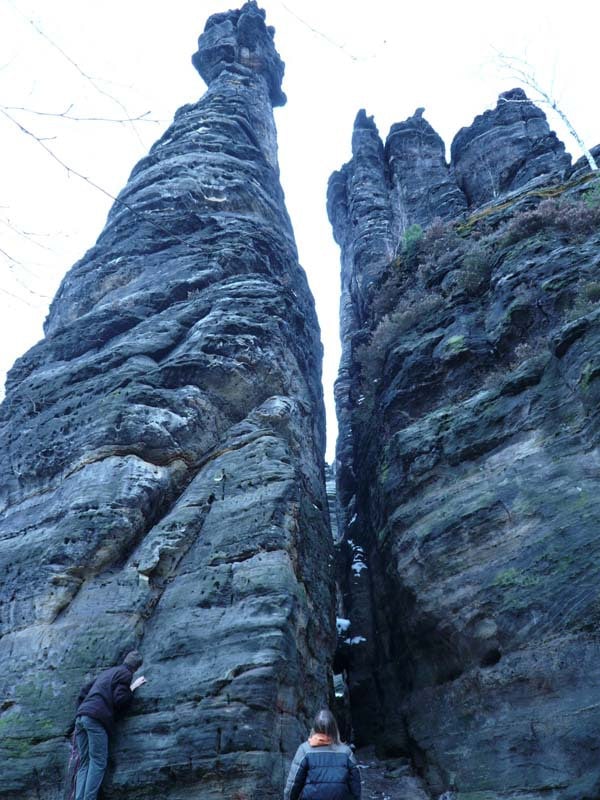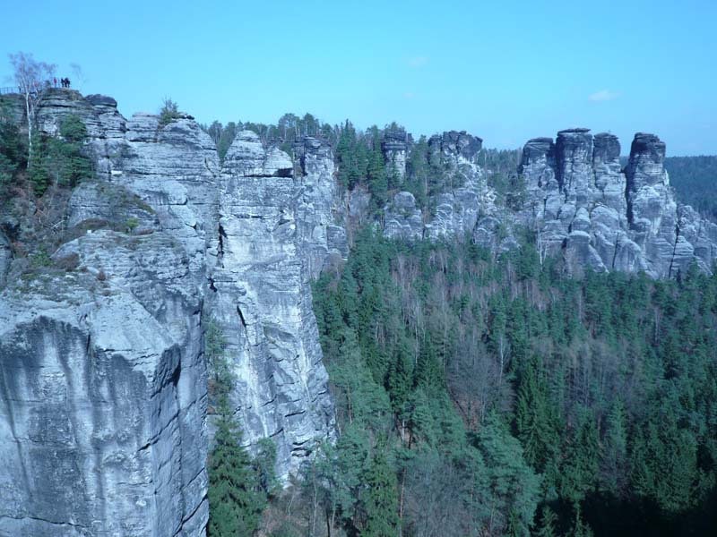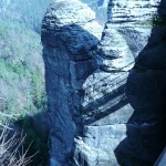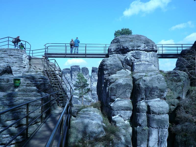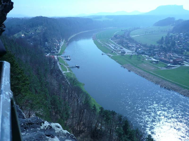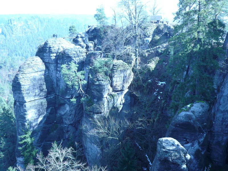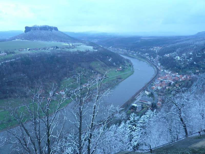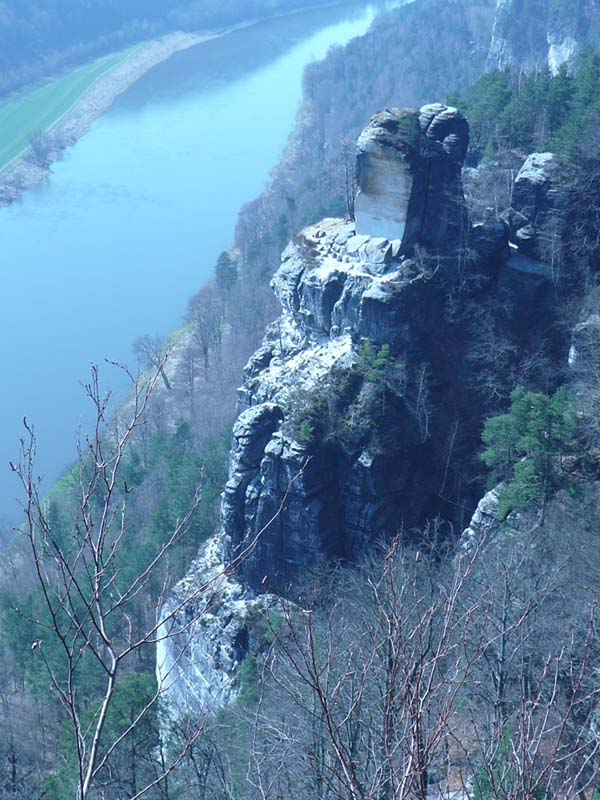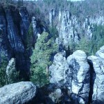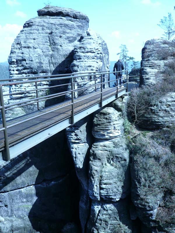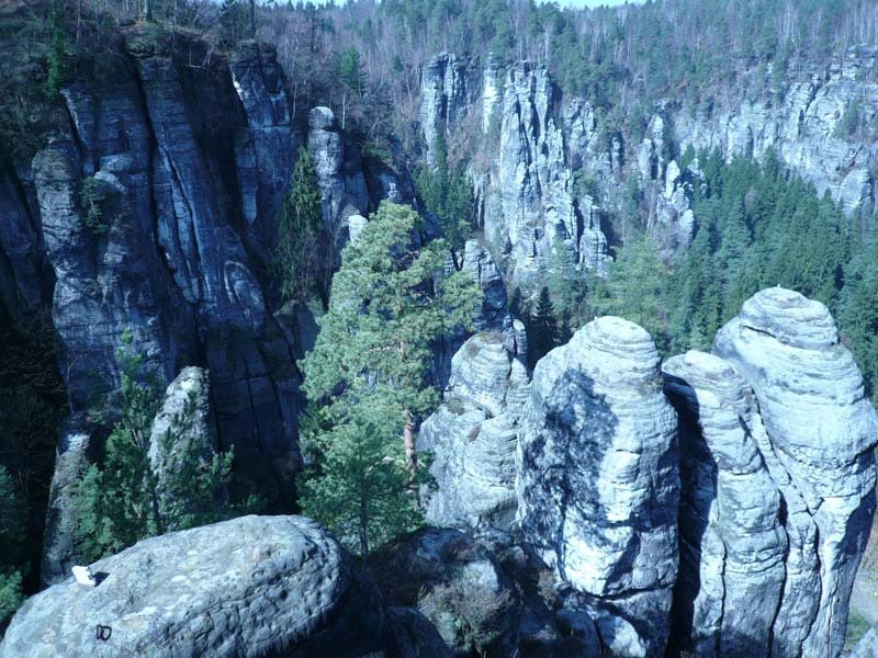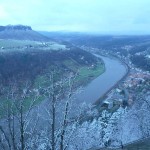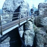 Osten 2009 haben wir uns die Sächsische Schweiz vorgenommen. Dazu haben wir uns eine Pension in der Nähe des Kurortes Rathen gemietet, und von da aus die Sächsische und die Böhmische Schweiz in Nordböhmen (Tschechien) mit unserem Hund Lea durchwandert. Obwohl es schon Ostern war, lag Schnee im Gebirge. Dennoch haben wir das zerklüftete Felsengebirge mit seinem außerordentlichen Formenreichtum auf engstem Raum genossen. Einmalig war der Panoramablick von der Bastei über das Elbtal und über das Elbsandsteingebirge. Die Bastei zählt zu den meistbesuchten Touristenattraktionen der Sächsischen Schweiz. Die Basteibrücke bei Rathen, die Herkulessäulen im Bielatal und die Sandstein-Felsbrücke Prebischtor in der Böhmischen Schweiz werden uns noch lange im Gedächtnis bleiben.